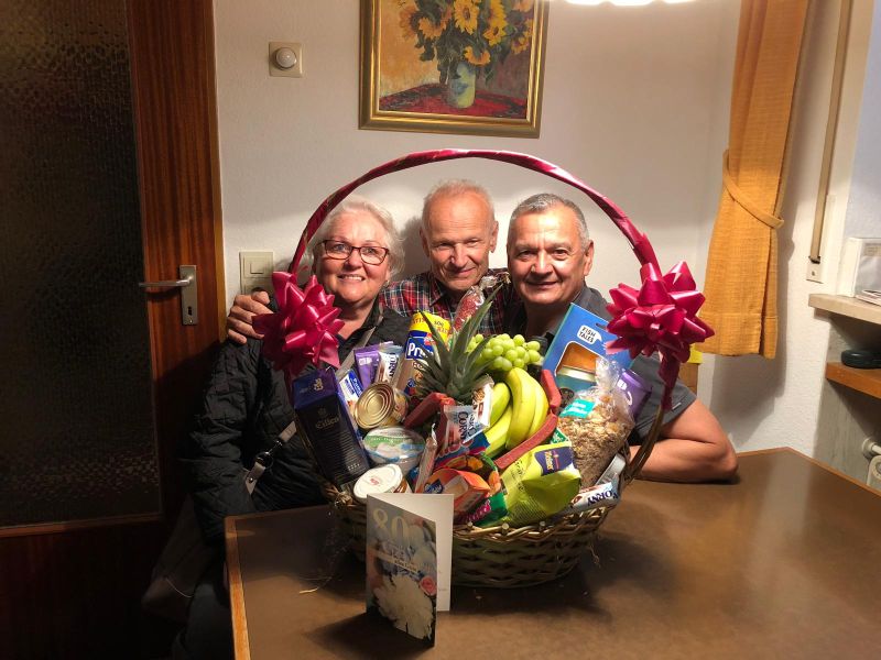 Zum 80. Geburtstag von unser Ehrenmitglied Ludwig Gleich. Die 1.Vorsitzende Frau Lehmann und der Sportwart Ziegler haben ihm einen Fresskorb überreicht.