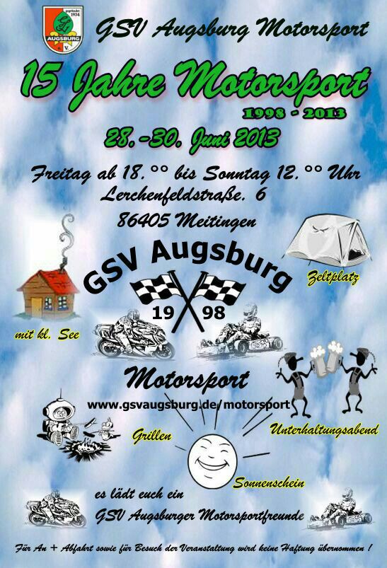 Die Motorsportfreunde des Gehörlosen Sportverein Augsburg e.V. laden am 28.-30. Juni 2013 zum 15jährigen Jubiläum am kleinen See ein.